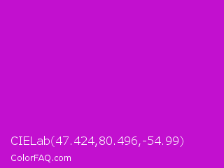 CIELab 47.424,80.496,-54.99 Color is a normal magenta color and the nearest color is Deep Magenta #cc00cc. Hex code #c210cf and RGB value is rgb(194,16,207). In RGB color space, this color is composed of 76% red, 6% green, 81% blue, In CMYK color space, this color is composed of 6% cyan, 92% magenta, 0% yellow , 19% black , In HSL color space, this color has a hue angle of 296° , 86% saturation and 44% lightness.