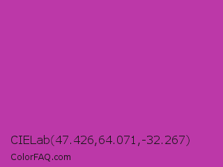 CIELab 47.426,64.071,-32.267 Color is a normal magenta color and the nearest color is Byzantine #bd33a4. Hex code #bc38a8 and RGB value is rgb(188,56,168). In RGB color space, this color is composed of 74% red, 22% green, 66% blue, In CMYK color space, this color is composed of 0% cyan, 70% magenta, 11% yellow , 26% black , In HSL color space, this color has a hue angle of 309° , 54% saturation and 48% lightness.