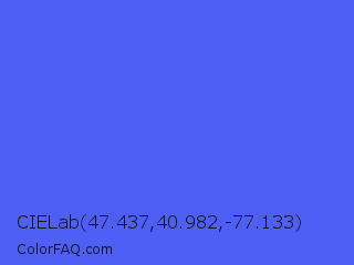CIELab 47.437,40.982,-77.133 Color is a light blue color and the nearest color is Ultramarine Blue #4166f5. Hex code #4d5ff5 and RGB value is rgb(77,95,245). In RGB color space, this color is composed of 30% red, 37% green, 96% blue, In CMYK color space, this color is composed of 69% cyan, 61% magenta, 0% yellow , 4% black , In HSL color space, this color has a hue angle of 234° , 89% saturation and 63% lightness.