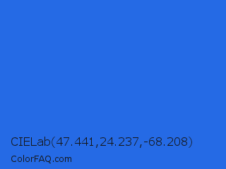CIELab 47.441,24.237,-68.208 Color is a normal blue color and the nearest color is Mariner #286acd. Hex code #256ae5 and RGB value is rgb(37,106,229). In RGB color space, this color is composed of 15% red, 42% green, 90% blue, In CMYK color space, this color is composed of 84% cyan, 54% magenta, 0% yellow , 10% black , In HSL color space, this color has a hue angle of 218° , 79% saturation and 52% lightness.