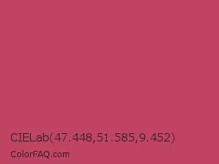 CIELab 47.448,51.585,9.452 Color is a normal red color and the nearest color is Popstar #be4f62. Hex code #c04563 and RGB value is rgb(192,69,99). In RGB color space, this color is composed of 75% red, 27% green, 39% blue, In CMYK color space, this color is composed of 0% cyan, 64% magenta, 48% yellow , 25% black , In HSL color space, this color has a hue angle of 345° , 49% saturation and 51% lightness.