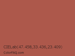 CIELab 47.458,33.436,23.409 Color is a normal red color and the nearest color is Giants Club #b05c52. Hex code #ad584b and RGB value is rgb(173,88,75). In RGB color space, this color is composed of 68% red, 35% green, 29% blue, In CMYK color space, this color is composed of 0% cyan, 49% magenta, 57% yellow , 32% black , In HSL color space, this color has a hue angle of 8° , 40% saturation and 49% lightness.
