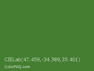 CIELab 47.459,-34.389,35.401 Color is a normal green color and the nearest color is Sap Green #507d2a. Hex code #447e31 and RGB value is rgb(68,126,49). In RGB color space, this color is composed of 27% red, 49% green, 19% blue, In CMYK color space, this color is composed of 46% cyan, 0% magenta, 61% yellow , 51% black , In HSL color space, this color has a hue angle of 105° , 44% saturation and 34% lightness.