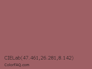 CIELab 47.461,26.281,8.142 Color is a normal red color and the nearest color is Copper Rose #996666. Hex code #9e5f64 and RGB value is rgb(158,95,100). In RGB color space, this color is composed of 62% red, 37% green, 39% blue, In CMYK color space, this color is composed of 0% cyan, 40% magenta, 37% yellow , 38% black , In HSL color space, this color has a hue angle of 355° , 25% saturation and 50% lightness.