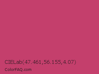 CIELab 47.461,56.155,4.07 Color is a normal rose color and the nearest color is Fuchsia Rose #c74375. Hex code #c43f6c and RGB value is rgb(196,63,108). In RGB color space, this color is composed of 77% red, 25% green, 42% blue, In CMYK color space, this color is composed of 0% cyan, 68% magenta, 45% yellow , 23% black , In HSL color space, this color has a hue angle of 340° , 53% saturation and 51% lightness.