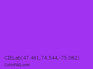 CIELab 47.461,74.544,-75.082 Color is a normal purple color and the nearest color is Veronica #a020f0. Hex code #a232f2 and RGB value is rgb(162,50,242). In RGB color space, this color is composed of 64% red, 20% green, 95% blue, In CMYK color space, this color is composed of 33% cyan, 79% magenta, 0% yellow , 5% black , In HSL color space, this color has a hue angle of 275° , 88% saturation and 57% lightness.