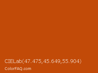 CIELab 47.475,45.649,55.904 Color is a normal orange color and the nearest color is Tia Maria #c1440e. Hex code #c24a08 and RGB value is rgb(194,74,8). In RGB color space, this color is composed of 76% red, 29% green, 3% blue, In CMYK color space, this color is composed of 0% cyan, 62% magenta, 96% yellow , 24% black , In HSL color space, this color has a hue angle of 21° , 92% saturation and 40% lightness.