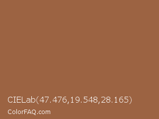 CIELab 47.476,19.548,28.165 Color is a normal orange color and the nearest color is Cape Palliser #a26645. Hex code #9c6342 and RGB value is rgb(156,99,66). In RGB color space, this color is composed of 61% red, 39% green, 26% blue, In CMYK color space, this color is composed of 0% cyan, 37% magenta, 58% yellow , 39% black , In HSL color space, this color has a hue angle of 22° , 41% saturation and 44% lightness.