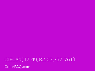 CIELab 47.49,82.03,-57.761 Color is a normal magenta color and the nearest color is Deep Magenta #cc00cc. Hex code #c208d4 and RGB value is rgb(194,8,212). In RGB color space, this color is composed of 76% red, 3% green, 83% blue, In CMYK color space, this color is composed of 8% cyan, 96% magenta, 0% yellow , 17% black , In HSL color space, this color has a hue angle of 295° , 93% saturation and 43% lightness.