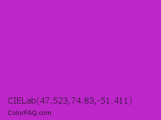 CIELab 47.523,74.83,-51.411 Color is a normal magenta color and the nearest color is Steel Pink #cc33cc. Hex code #bd26c9 and RGB value is rgb(189,38,201). In RGB color space, this color is composed of 74% red, 15% green, 79% blue, In CMYK color space, this color is composed of 6% cyan, 81% magenta, 0% yellow , 21% black , In HSL color space, this color has a hue angle of 296° , 68% saturation and 47% lightness.