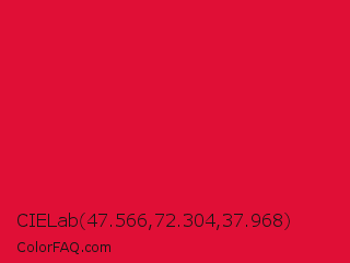 CIELab 47.566,72.304,37.968 Color is a normal red color and the nearest color is Crimson #dc143c. Hex code #e00f36 and RGB value is rgb(224,15,54). In RGB color space, this color is composed of 88% red, 6% green, 21% blue, In CMYK color space, this color is composed of 0% cyan, 93% magenta, 76% yellow , 12% black , In HSL color space, this color has a hue angle of 349° , 87% saturation and 47% lightness.