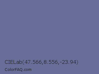 CIELab 47.566,8.556,-23.94 Color is a normal blue color and the nearest color is Dark Blue Gray #666699. Hex code #696e99 and RGB value is rgb(105,110,153). In RGB color space, this color is composed of 41% red, 43% green, 60% blue, In CMYK color space, this color is composed of 31% cyan, 28% magenta, 0% yellow , 40% black , In HSL color space, this color has a hue angle of 234° , 19% saturation and 51% lightness.