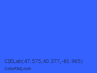 CIELab 47.575,40.377,-81.965 Color is a normal blue color and the nearest color is Ultramarine Blue #4166f5. Hex code #3561fe and RGB value is rgb(53,97,254). In RGB color space, this color is composed of 21% red, 38% green, 100% blue, In CMYK color space, this color is composed of 79% cyan, 62% magenta, 0% yellow , 0% black , In HSL color space, this color has a hue angle of 227° , 99% saturation and 60% lightness.