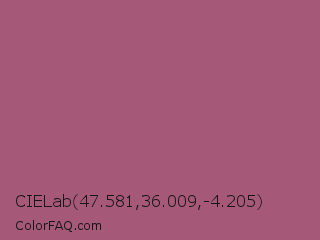 CIELab 47.581,36.009,-4.205 Color is a normal rose color and the nearest color is China Rose #a8516e. Hex code #a65879 and RGB value is rgb(166,88,121). In RGB color space, this color is composed of 65% red, 35% green, 47% blue, In CMYK color space, this color is composed of 0% cyan, 47% magenta, 27% yellow , 35% black , In HSL color space, this color has a hue angle of 335° , 31% saturation and 50% lightness.