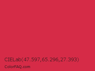 CIELab 47.597,65.296,27.393 Color is a normal red color and the nearest color is Rusty Red #da2c43. Hex code #d62b47 and RGB value is rgb(214,43,71). In RGB color space, this color is composed of 84% red, 17% green, 28% blue, In CMYK color space, this color is composed of 0% cyan, 80% magenta, 67% yellow , 16% black , In HSL color space, this color has a hue angle of 350° , 68% saturation and 50% lightness.