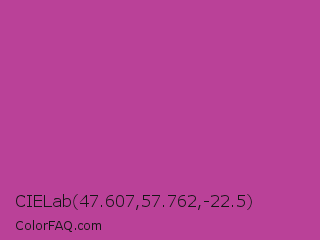 CIELab 47.607,57.762,-22.5 Color is a normal magenta color and the nearest color is Byzantine #bd33a4. Hex code #ba4198 and RGB value is rgb(186,65,152). In RGB color space, this color is composed of 73% red, 25% green, 60% blue, In CMYK color space, this color is composed of 0% cyan, 65% magenta, 18% yellow , 27% black , In HSL color space, this color has a hue angle of 317° , 48% saturation and 49% lightness.