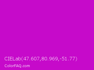 CIELab 47.607,80.969,-51.77 Color is a normal magenta color and the nearest color is Deep Magenta #cc00cc. Hex code #c60aca and RGB value is rgb(198,10,202). In RGB color space, this color is composed of 78% red, 4% green, 79% blue, In CMYK color space, this color is composed of 2% cyan, 95% magenta, 0% yellow , 21% black , In HSL color space, this color has a hue angle of 299° , 91% saturation and 42% lightness.