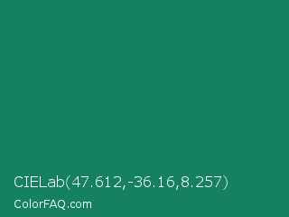 CIELab 47.612,-36.16,8.257 Color is a dark green color and the nearest color is Deep Green Cyan Turquoise #0e7c61. Hex code #168062 and RGB value is rgb(22,128,98). In RGB color space, this color is composed of 9% red, 50% green, 38% blue, In CMYK color space, this color is composed of 83% cyan, 0% magenta, 23% yellow , 50% black , In HSL color space, this color has a hue angle of 163° , 71% saturation and 29% lightness.