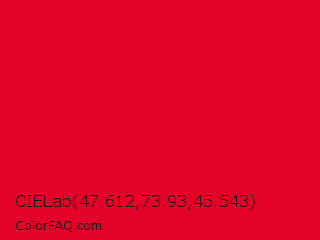 CIELab 47.612,73.93,45.543 Color is a normal red color and the nearest color is Spanish Red #e60026. Hex code #e30029 and RGB value is rgb(227,0,41). In RGB color space, this color is composed of 89% red, 0% green, 16% blue, In CMYK color space, this color is composed of 0% cyan, 100% magenta, 82% yellow , 11% black , In HSL color space, this color has a hue angle of 349° , 100% saturation and 45% lightness.