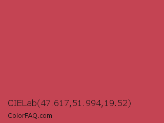 CIELab 47.617,51.994,19.52 Color is a normal red color and the nearest color is Brick Red #cb4154. Hex code #c44453 and RGB value is rgb(196,68,83). In RGB color space, this color is composed of 77% red, 27% green, 33% blue, In CMYK color space, this color is composed of 0% cyan, 65% magenta, 58% yellow , 23% black , In HSL color space, this color has a hue angle of 353° , 52% saturation and 52% lightness.
