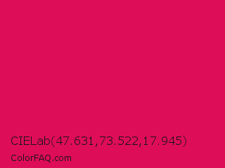 CIELab 47.631,73.522,17.945 Color is a normal rose color and the nearest color is Razzmatazz Crayola #e30b5c. Hex code #de0d57 and RGB value is rgb(222,13,87). In RGB color space, this color is composed of 87% red, 5% green, 34% blue, In CMYK color space, this color is composed of 0% cyan, 94% magenta, 61% yellow , 13% black , In HSL color space, this color has a hue angle of 339° , 89% saturation and 46% lightness.
