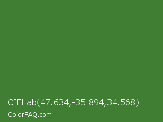 CIELab 47.634,-35.894,34.568 Color is a normal green color and the nearest color is Sap Green #507d2a. Hex code #407f33 and RGB value is rgb(64,127,51). In RGB color space, this color is composed of 25% red, 50% green, 20% blue, In CMYK color space, this color is composed of 50% cyan, 0% magenta, 60% yellow , 50% black , In HSL color space, this color has a hue angle of 110° , 43% saturation and 35% lightness.