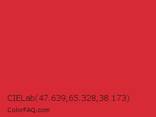 CIELab 47.639,65.328,38.173 Color is a normal red color and the nearest color is Alizarin Crimson #e32636. Hex code #d82a35 and RGB value is rgb(216,42,53). In RGB color space, this color is composed of 85% red, 16% green, 21% blue, In CMYK color space, this color is composed of 0% cyan, 81% magenta, 75% yellow , 15% black , In HSL color space, this color has a hue angle of 356° , 69% saturation and 51% lightness.
