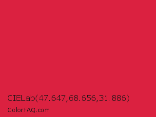 CIELab 47.647,68.656,31.886 Color is a normal red color and the nearest color is Rusty Red #da2c43. Hex code #db2140 and RGB value is rgb(219,33,64). In RGB color space, this color is composed of 86% red, 13% green, 25% blue, In CMYK color space, this color is composed of 0% cyan, 85% magenta, 71% yellow , 14% black , In HSL color space, this color has a hue angle of 350° , 74% saturation and 49% lightness.