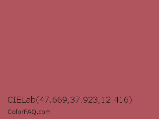 CIELab 47.669,37.923,12.416 Color is a normal red color and the nearest color is Matrix #b05d54. Hex code #b0555e and RGB value is rgb(176,85,94). In RGB color space, this color is composed of 69% red, 33% green, 37% blue, In CMYK color space, this color is composed of 0% cyan, 52% magenta, 47% yellow , 31% black , In HSL color space, this color has a hue angle of 354° , 37% saturation and 51% lightness.