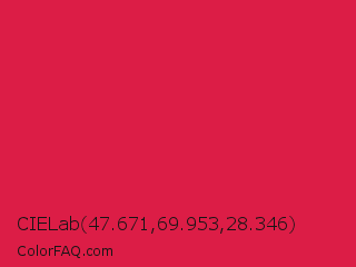 CIELab 47.671,69.953,28.346 Color is a normal red color and the nearest color is Spanish Crimson #e51a4c. Hex code #dc1d46 and RGB value is rgb(220,29,70). In RGB color space, this color is composed of 86% red, 11% green, 27% blue, In CMYK color space, this color is composed of 0% cyan, 87% magenta, 68% yellow , 14% black , In HSL color space, this color has a hue angle of 347° , 77% saturation and 49% lightness.