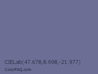 CIELab 47.678,8.698,-21.977 Color is a normal blue color and the nearest color is Dark Blue Gray #666699. Hex code #6c6e96 and RGB value is rgb(108,110,150). In RGB color space, this color is composed of 42% red, 43% green, 59% blue, In CMYK color space, this color is composed of 28% cyan, 27% magenta, 0% yellow , 41% black , In HSL color space, this color has a hue angle of 237° , 17% saturation and 51% lightness.