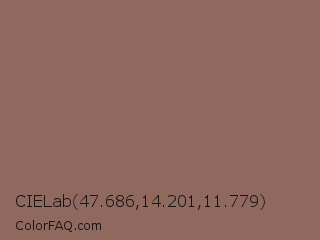 CIELab 47.686,14.201,11.779 Color is a normal red color and the nearest color is Beaver Crayola #926f5b. Hex code #8f685e and RGB value is rgb(143,104,94). In RGB color space, this color is composed of 56% red, 41% green, 37% blue, In CMYK color space, this color is composed of 0% cyan, 27% magenta, 34% yellow , 44% black , In HSL color space, this color has a hue angle of 12° , 21% saturation and 46% lightness.