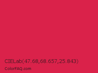 CIELab 47.68,68.657,25.843 Color is a normal red color and the nearest color is Rusty Red #da2c43. Hex code #da224a and RGB value is rgb(218,34,74). In RGB color space, this color is composed of 85% red, 13% green, 29% blue, In CMYK color space, this color is composed of 0% cyan, 84% magenta, 66% yellow , 15% black , In HSL color space, this color has a hue angle of 347° , 73% saturation and 49% lightness.