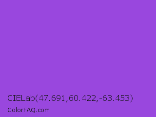 CIELab 47.691,60.422,-63.453 Color is a normal purple color and the nearest color is Navy Purple #9457eb. Hex code #9947de and RGB value is rgb(153,71,222). In RGB color space, this color is composed of 60% red, 28% green, 87% blue, In CMYK color space, this color is composed of 31% cyan, 68% magenta, 0% yellow , 13% black , In HSL color space, this color has a hue angle of 273° , 70% saturation and 57% lightness.
