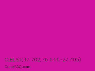 CIELab 47.702,76.644,-27.405 Color is a normal magenta color and the nearest color is Red Violet #c71585. Hex code #d112a1 and RGB value is rgb(209,18,161). In RGB color space, this color is composed of 82% red, 7% green, 63% blue, In CMYK color space, this color is composed of 0% cyan, 91% magenta, 23% yellow , 18% black , In HSL color space, this color has a hue angle of 315° , 84% saturation and 45% lightness.