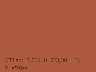 CIELab 47.709,31.523,30.113 Color is a normal red color and the nearest color is Brown Rust #af593e. Hex code #ad5a40 and RGB value is rgb(173,90,64). In RGB color space, this color is composed of 68% red, 35% green, 25% blue, In CMYK color space, this color is composed of 0% cyan, 48% magenta, 63% yellow , 32% black , In HSL color space, this color has a hue angle of 14° , 46% saturation and 46% lightness.