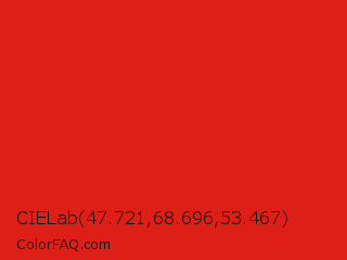CIELab 47.721,68.696,53.467 Color is a normal red color and the nearest color is Maximum Red #d92121. Hex code #de1f18 and RGB value is rgb(222,31,24). In RGB color space, this color is composed of 87% red, 12% green, 9% blue, In CMYK color space, this color is composed of 0% cyan, 86% magenta, 89% yellow , 13% black , In HSL color space, this color has a hue angle of 2° , 80% saturation and 48% lightness.