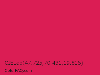CIELab 47.725,70.431,19.815 Color is a normal rose color and the nearest color is Spanish Crimson #e51a4c. Hex code #db1d54 and RGB value is rgb(219,29,84). In RGB color space, this color is composed of 86% red, 11% green, 33% blue, In CMYK color space, this color is composed of 0% cyan, 87% magenta, 62% yellow , 14% black , In HSL color space, this color has a hue angle of 343° , 77% saturation and 49% lightness.