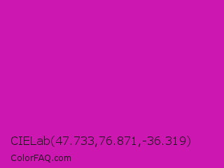 CIELab 47.733,76.871,-36.319 Color is a normal magenta color and the nearest color is Byzantine #bd33a4. Hex code #cc17b0 and RGB value is rgb(204,23,176). In RGB color space, this color is composed of 80% red, 9% green, 69% blue, In CMYK color space, this color is composed of 0% cyan, 89% magenta, 14% yellow , 20% black , In HSL color space, this color has a hue angle of 309° , 80% saturation and 45% lightness.