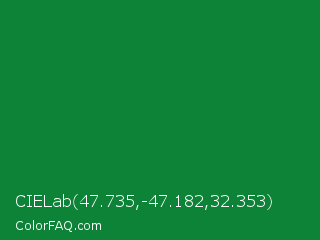 CIELab 47.735,-47.182,32.353 Color is a dark green color and the nearest color is La Salle Green #087830. Hex code #0c8337 and RGB value is rgb(12,131,55). In RGB color space, this color is composed of 5% red, 51% green, 22% blue, In CMYK color space, this color is composed of 91% cyan, 0% magenta, 58% yellow , 49% black , In HSL color space, this color has a hue angle of 142° , 83% saturation and 28% lightness.