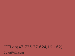 CIELab 47.735,37.624,19.162 Color is a normal red color and the nearest color is Giants Club #b05c52. Hex code #b25553 and RGB value is rgb(178,85,83). In RGB color space, this color is composed of 70% red, 33% green, 33% blue, In CMYK color space, this color is composed of 0% cyan, 52% magenta, 53% yellow , 30% black , In HSL color space, this color has a hue angle of 1° , 38% saturation and 51% lightness.