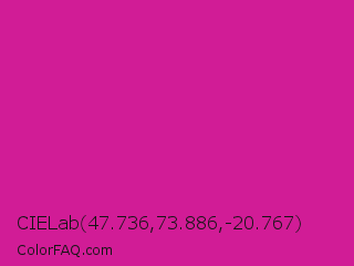 CIELab 47.736,73.886,-20.767 Color is a normal magenta color and the nearest color is Royal Fuchsia #ca2c92. Hex code #d11c96 and RGB value is rgb(209,28,150). In RGB color space, this color is composed of 82% red, 11% green, 59% blue, In CMYK color space, this color is composed of 0% cyan, 87% magenta, 28% yellow , 18% black , In HSL color space, this color has a hue angle of 320° , 76% saturation and 46% lightness.