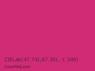 CIELab 47.741,67.301,-1.349 Color is a normal rose color and the nearest color is Telemagenta #cf3476. Hex code #d12b76 and RGB value is rgb(209,43,118). In RGB color space, this color is composed of 82% red, 17% green, 46% blue, In CMYK color space, this color is composed of 0% cyan, 79% magenta, 44% yellow , 18% black , In HSL color space, this color has a hue angle of 333° , 66% saturation and 49% lightness.