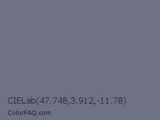 CIELab 47.748,3.912,-11.78 Color is a normal blue color and the nearest color is Storm Gray #717486. Hex code #6e7085 and RGB value is rgb(110,112,133). In RGB color space, this color is composed of 43% red, 44% green, 52% blue, In CMYK color space, this color is composed of 17% cyan, 16% magenta, 0% yellow , 48% black , In HSL color space, this color has a hue angle of 235° , 9% saturation and 48% lightness.