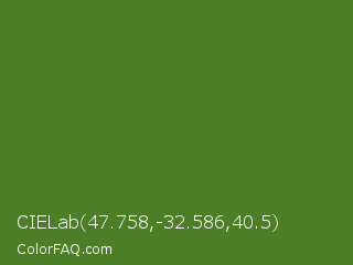 CIELab 47.758,-32.586,40.5 Color is a normal green color and the nearest color is Sap Green #507d2a. Hex code #4c7e27 and RGB value is rgb(76,126,39). In RGB color space, this color is composed of 30% red, 49% green, 15% blue, In CMYK color space, this color is composed of 40% cyan, 0% magenta, 69% yellow , 51% black , In HSL color space, this color has a hue angle of 94° , 53% saturation and 32% lightness.