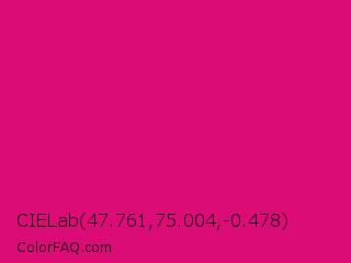 CIELab 47.761,75.004,-0.478 Color is a normal rose color and the nearest color is Red Purple #e40078. Hex code #db0c75 and RGB value is rgb(219,12,117). In RGB color space, this color is composed of 86% red, 5% green, 46% blue, In CMYK color space, this color is composed of 0% cyan, 95% magenta, 47% yellow , 14% black , In HSL color space, this color has a hue angle of 330° , 90% saturation and 45% lightness.