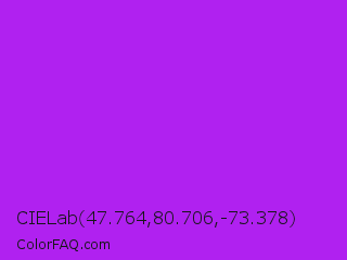 CIELab 47.764,80.706,-73.378 Color is a normal purple color and the nearest color is Veronica #a020f0. Hex code #b021f0 and RGB value is rgb(176,33,240). In RGB color space, this color is composed of 69% red, 13% green, 94% blue, In CMYK color space, this color is composed of 27% cyan, 86% magenta, 0% yellow , 6% black , In HSL color space, this color has a hue angle of 281° , 87% saturation and 54% lightness.