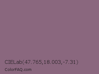CIELab 47.765,18.003,-7.31 Color is a normal magenta color and the nearest color is Chinese Violet #856088. Hex code #8a677e and RGB value is rgb(138,103,126). In RGB color space, this color is composed of 54% red, 40% green, 49% blue, In CMYK color space, this color is composed of 0% cyan, 25% magenta, 9% yellow , 46% black , In HSL color space, this color has a hue angle of 321° , 15% saturation and 47% lightness.