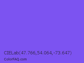 CIELab 47.766,54.064,-73.647 Color is a light indigo color and the nearest color is Medium Slate Blue #7b68ee. Hex code #7c52f0 and RGB value is rgb(124,82,240). In RGB color space, this color is composed of 49% red, 32% green, 94% blue, In CMYK color space, this color is composed of 48% cyan, 66% magenta, 0% yellow , 6% black , In HSL color space, this color has a hue angle of 256° , 84% saturation and 63% lightness.