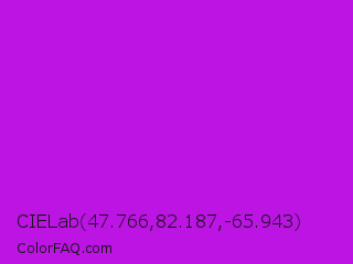 CIELab 47.766,82.187,-65.943 Color is a normal purple color and the nearest color is Vivid Mulberry #b80ce3. Hex code #bb14e3 and RGB value is rgb(187,20,227). In RGB color space, this color is composed of 73% red, 8% green, 89% blue, In CMYK color space, this color is composed of 18% cyan, 91% magenta, 0% yellow , 11% black , In HSL color space, this color has a hue angle of 288° , 84% saturation and 48% lightness.